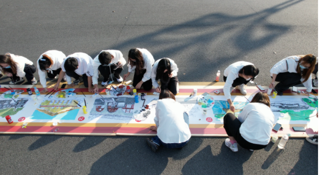 活动现场,百米长的画板依次排好,百名青年党员学子同时开工,大家以画传情、以画抒志,把对党的热爱和对祖国的深情浓缩在画纸之上。