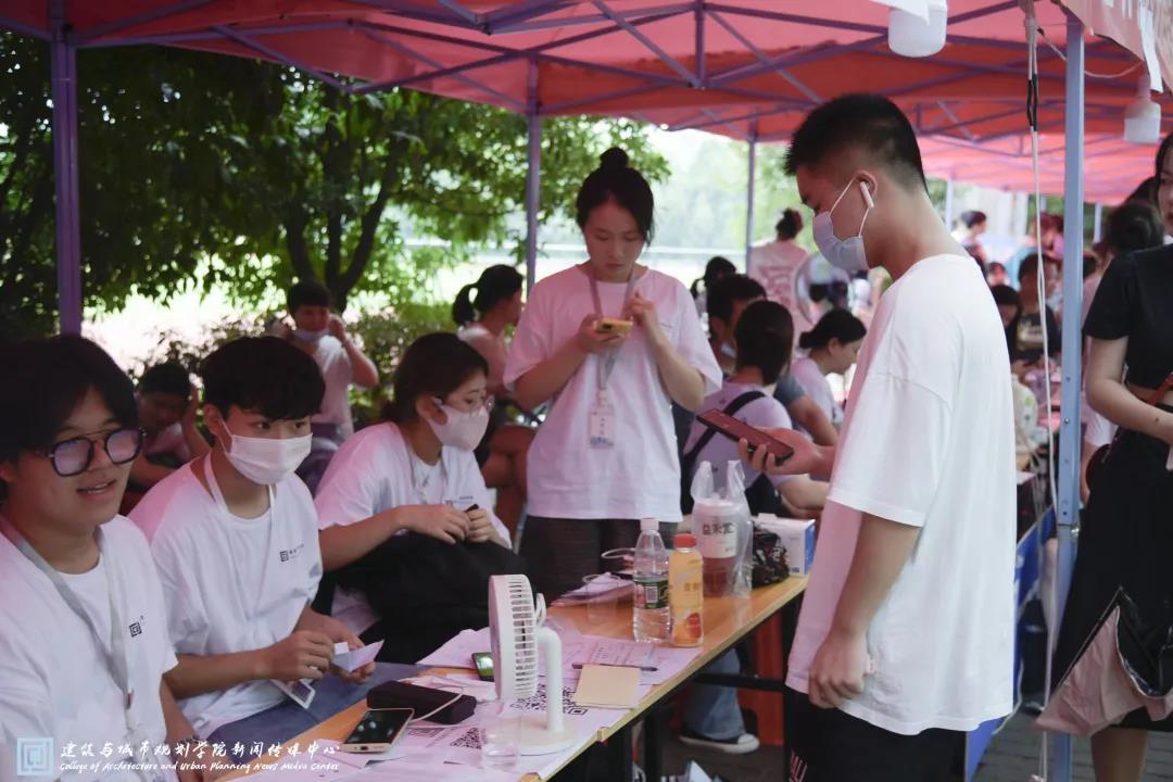 2021年9月12日下午2:00,值班人员和迎新志愿者们来到龙城大道的球速体育迎新处,开始迎接前来报道的新生。